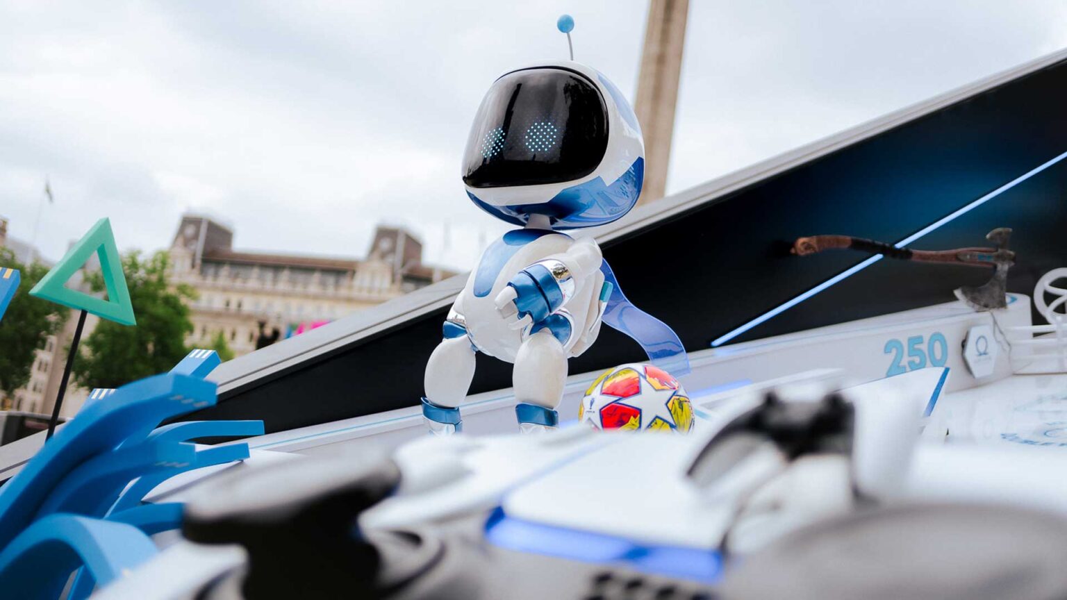 A Potters Field Park, près de London Bridge, l’installation ‘Astro at Tower Bridge’ présente une statue de Battle of the Ball, mettant en vedette Astro Bot en arrière-plan, idéal pour des selfies ou des photos de paysage ludiques pour marquer l’occasion.